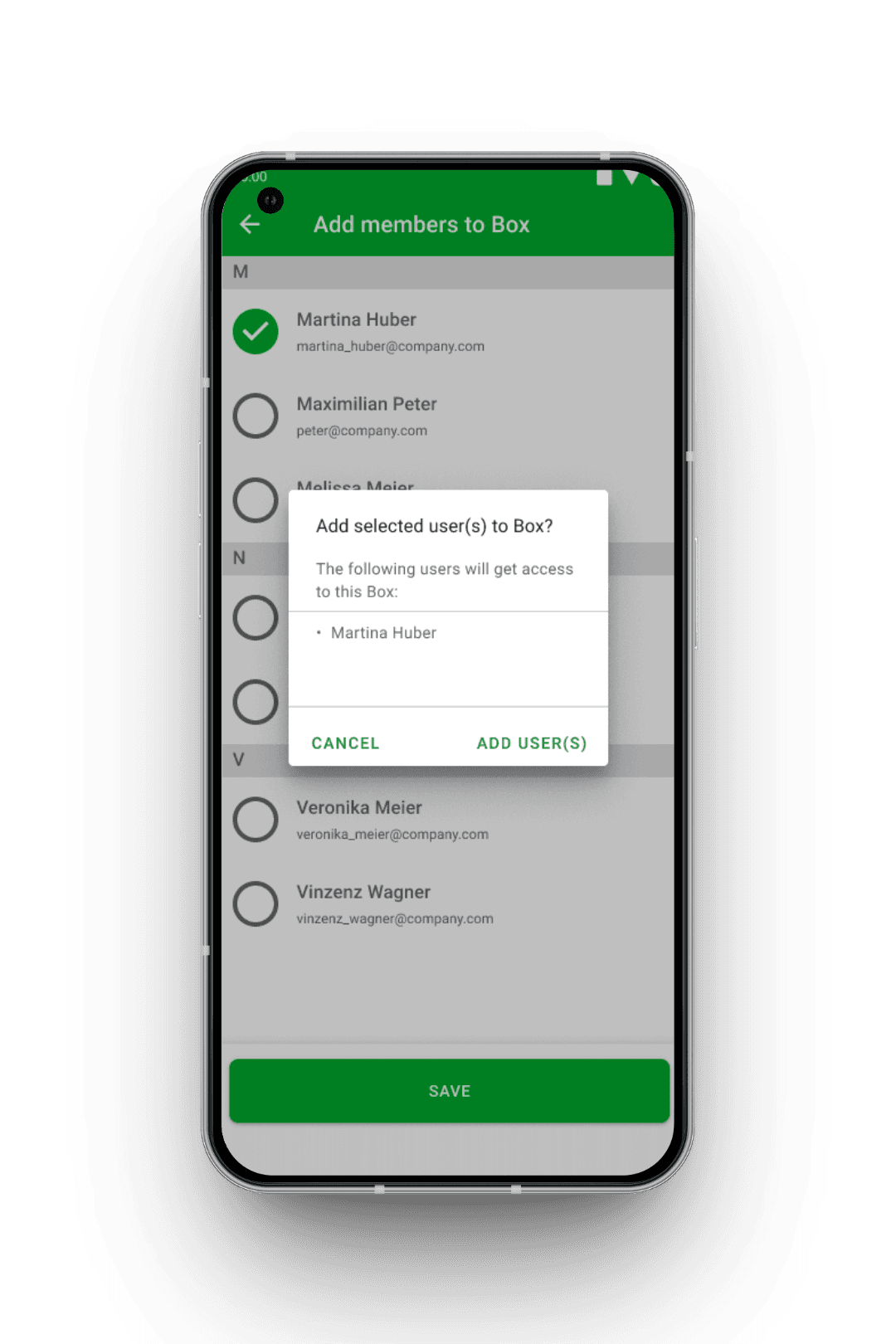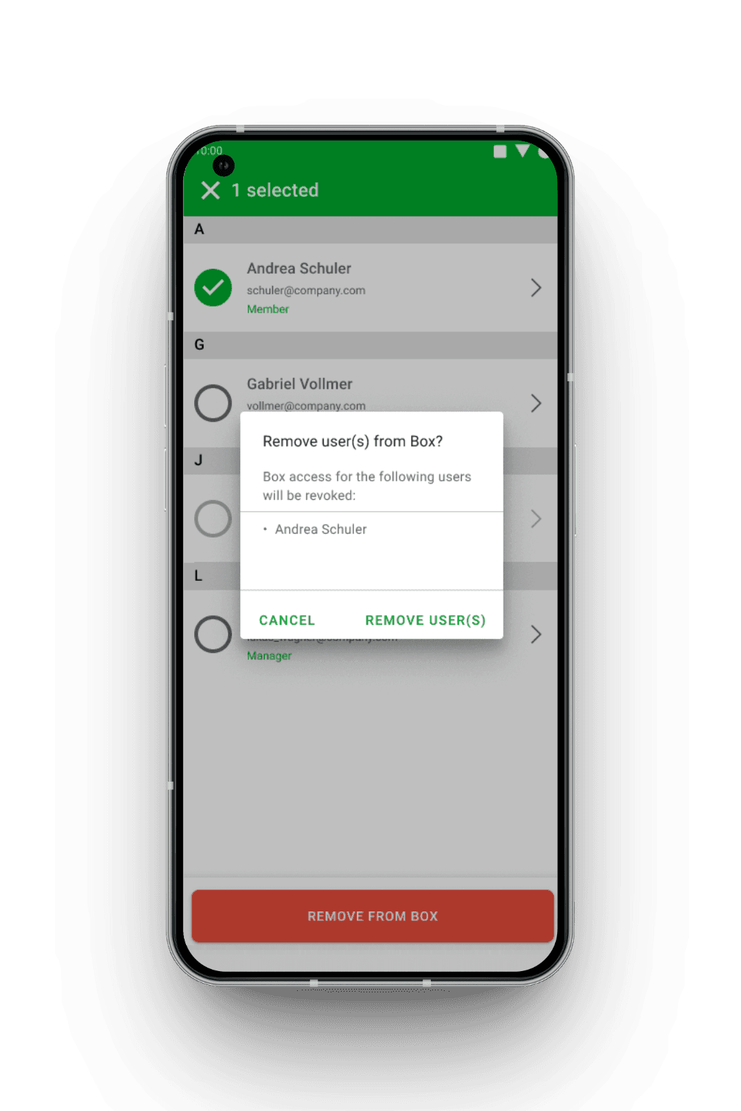 Wie in der Web-Version erlaubt auch die Mobile-Liste die Mehrfachauswahl über Checkboxen am Zeilenanfang. Mobil beschränkt sich die Mehrfach-Aktion jedoch auf das gemeinsame Entfernen mehrerer Mitglieder. Änderungen an Berechtigungen sind mobil nur für einzelne Nutzer über die Detailseite möglich.