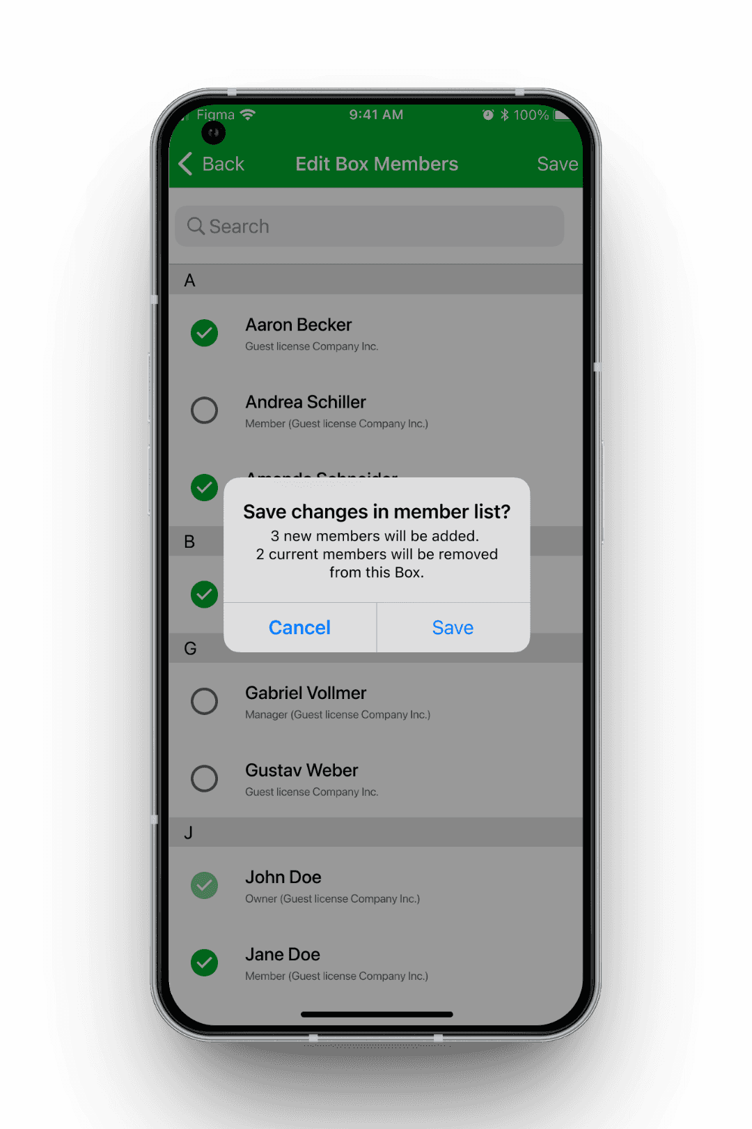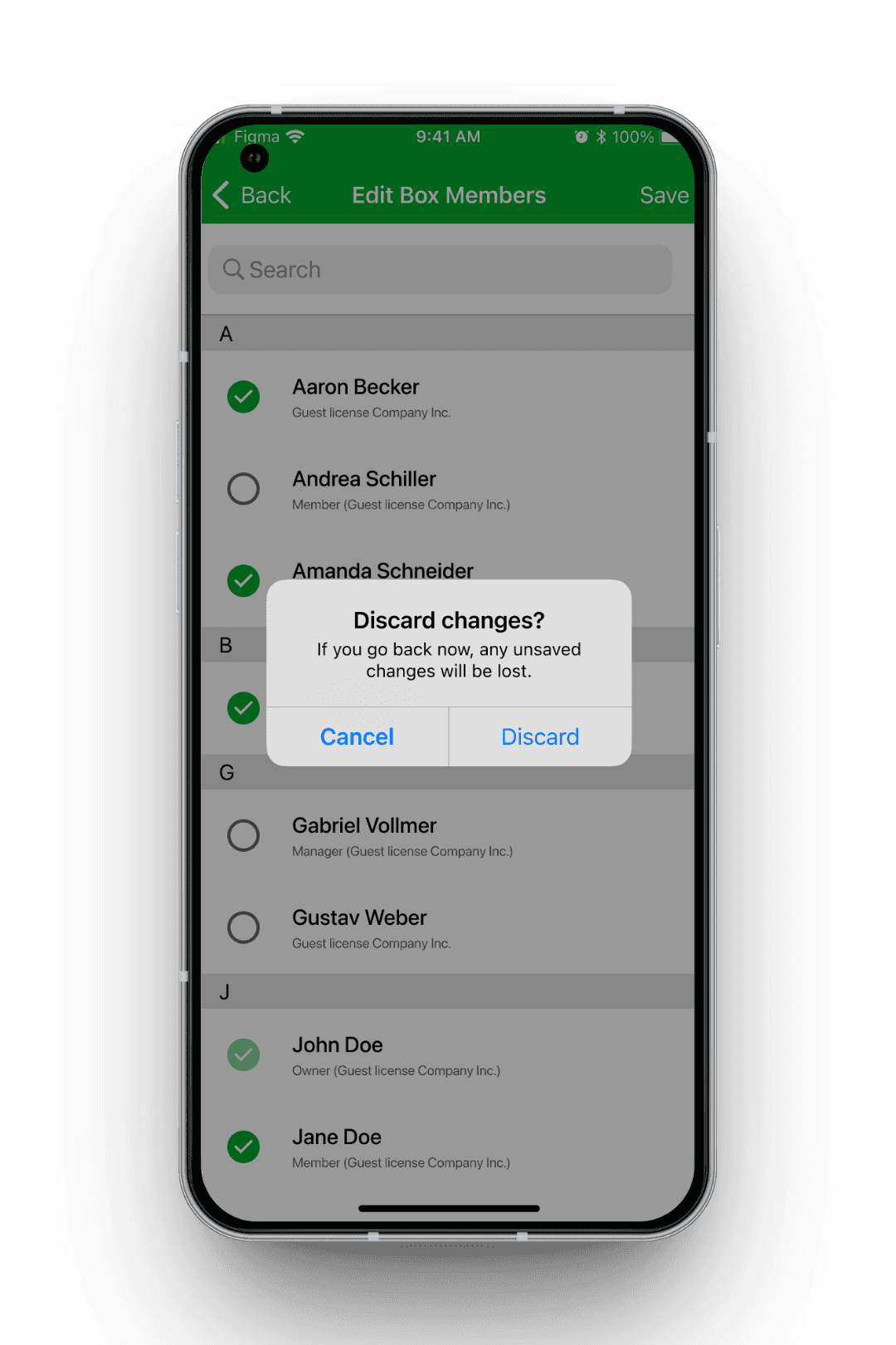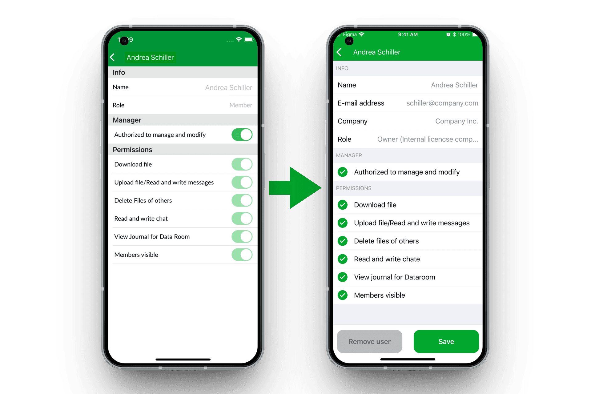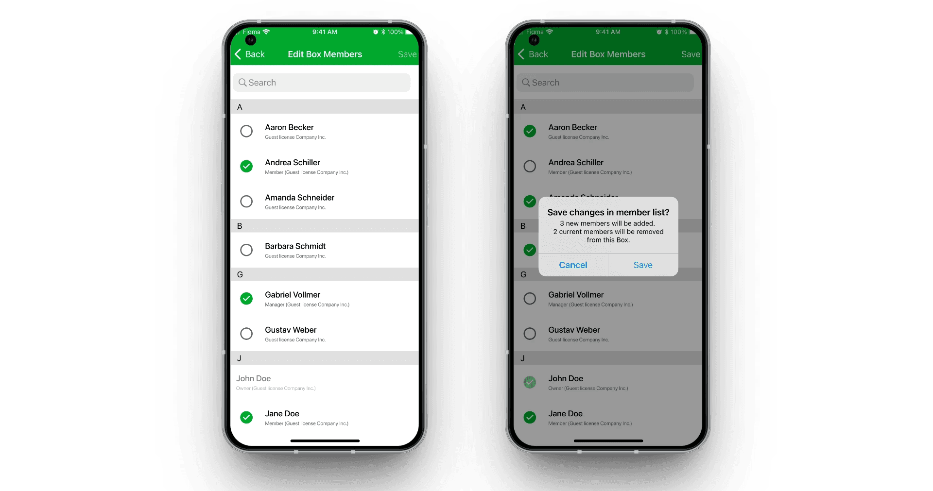 In einer frühen Variante für iOS befand sich die Checkbox bei der Mehrfachauswahl rechts neben dem Namen, zudem wurden auf der Detailseite eines Nutzers iOS-typische Toggles für die Berechtigungen verwendet. Im Nutzertest zeigte sich, dass der plattformübergreifende Wechsel zwischen iOS und Android dadurch anstrengend war, insbesondere für Administratoren, die beide Betriebssysteme parallel nutzen.