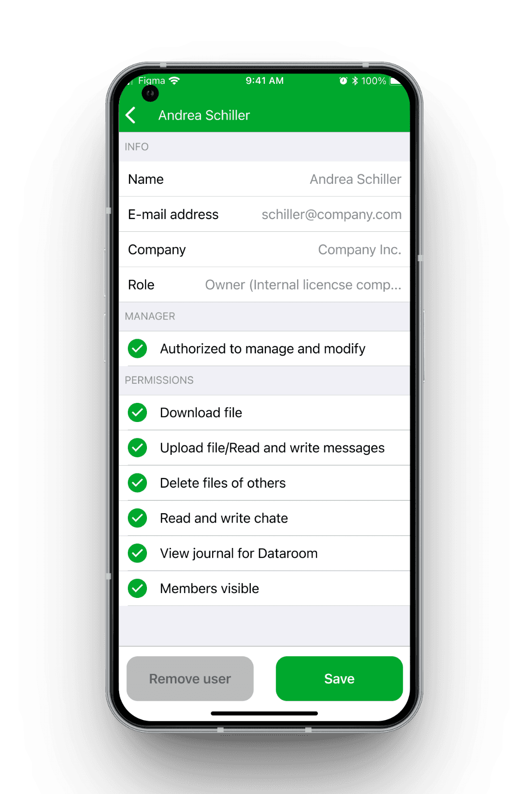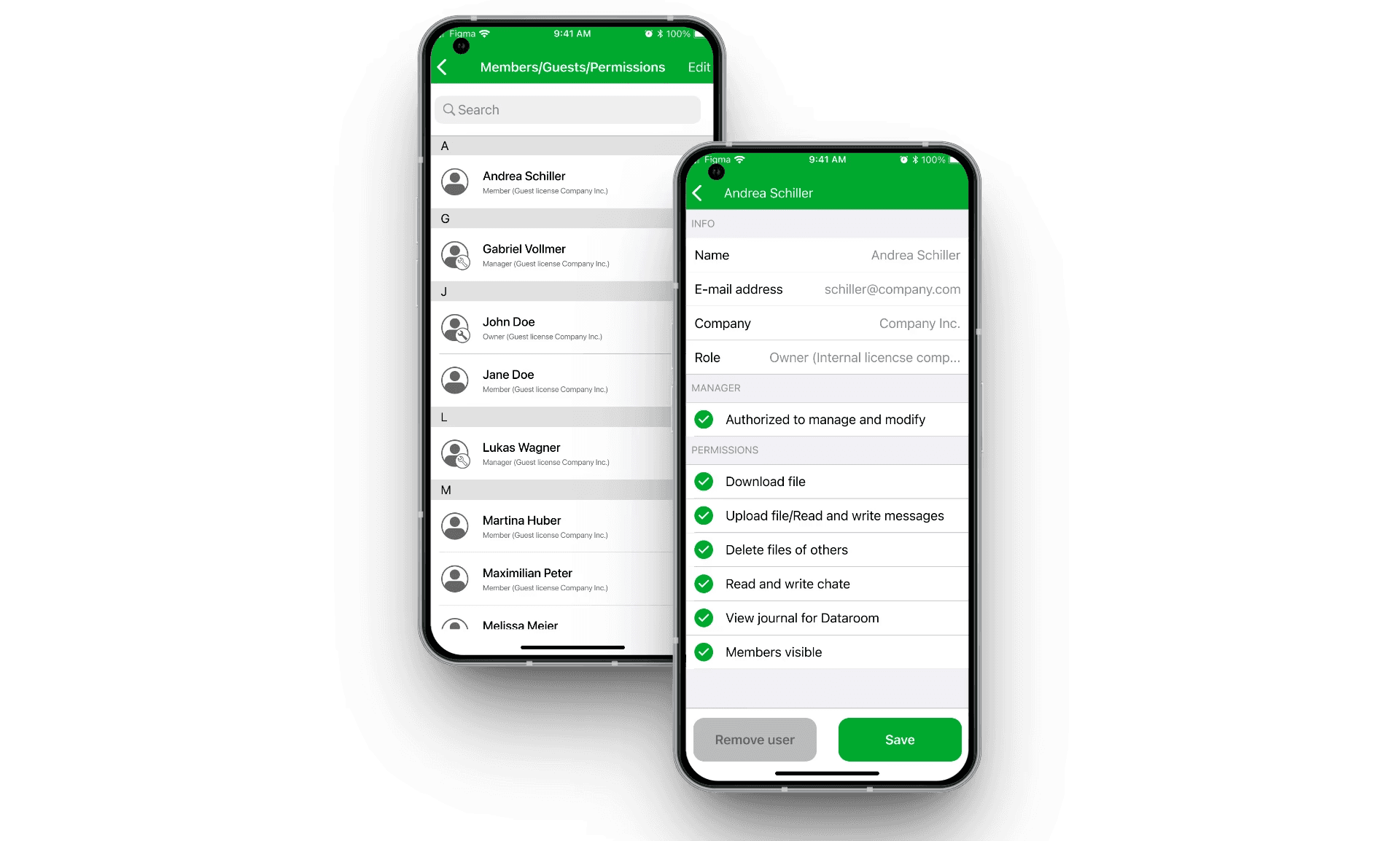 Was in der Web-Version auf einer einzigen Seite nebeneinander Platz fand, wurde für Mobile in zwei Ebenen aufgeteilt: eine Übersichtsliste mit allen Mitgliedern der Box und einer Chevron-Angabe nach rechts sowie eine Detailseite pro Nutzer mit den einzelnen Berechtigungen und einem „Remove user"-Button.