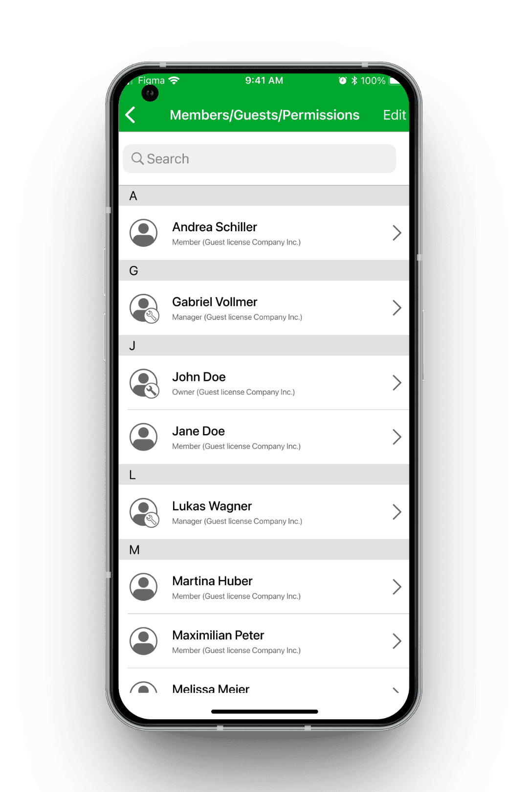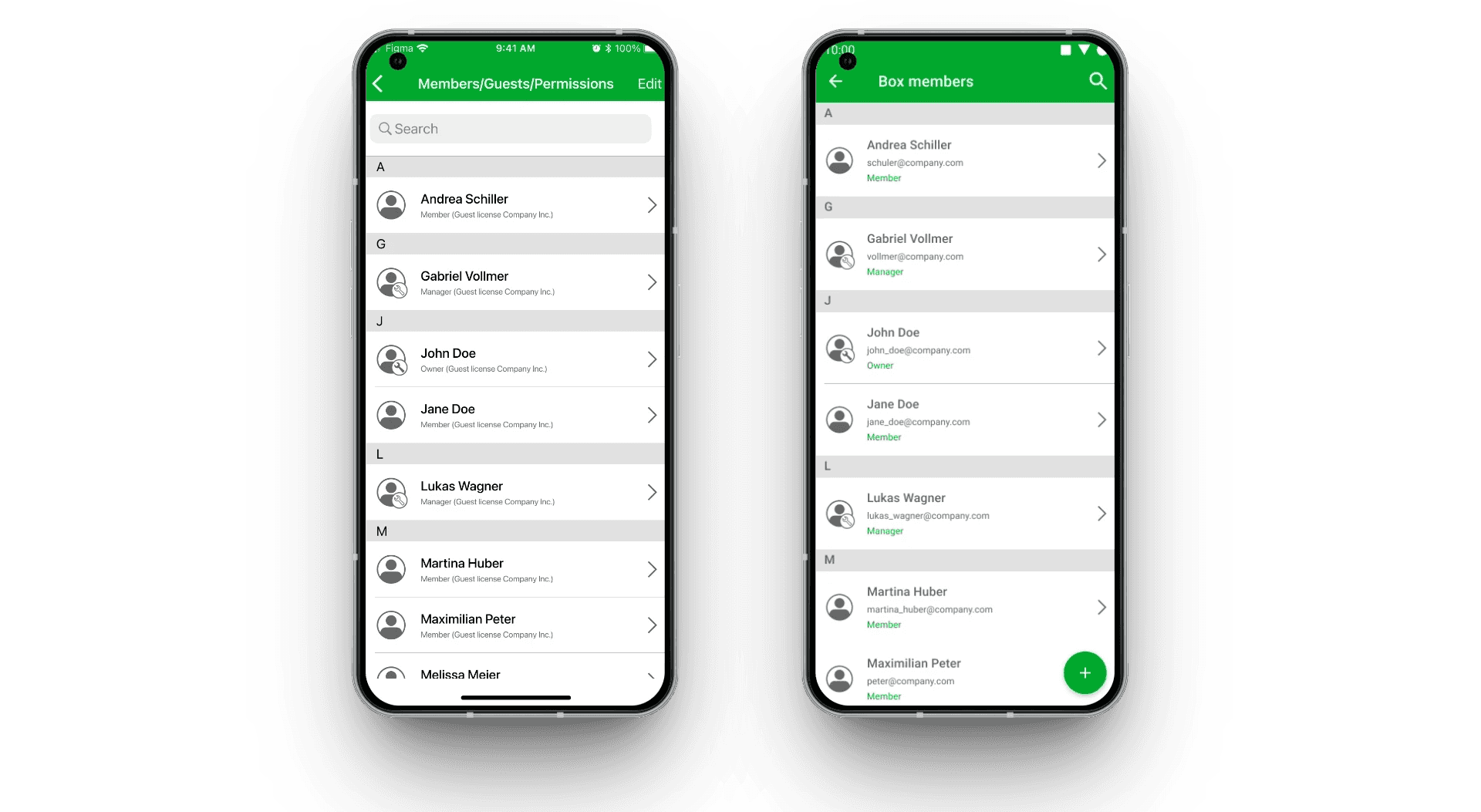 In der Web-Anwendung ist die Verwaltung dieser Box-Mitglieder als breite Tabelle umgesetzt: eine Liste mit Namen auf der linken Seite, daneben mehrere Spalten mit Eigenschaften und Berechtigungen, die pro Nutzer per Checkbox umgeschaltet werden können. Ziel dieses Projekts war, die Mitglieder-Verwaltung auch in den Mobile-Apps bereitzustellen, ohne relevante Funktionalität gegenüber der Web-Version zu verlieren.