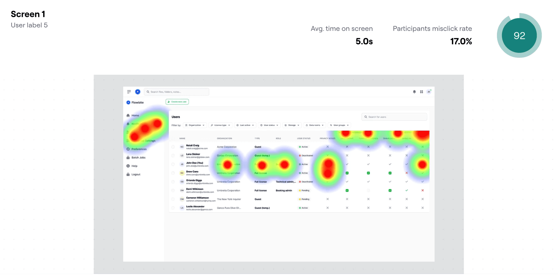 Im Verlauf des Projekts wechselten wir teilweise von moderierten zu unmoderierten Tests mit Hilfe des Tools Maze um schneller und mit größerer Stichprobe Feedback zu erhalten. Dies erhöhte die Iterationsgeschwindigkeit spürbar. Maze erlaubte uns die Mausbewegungen und Klick unserer Probanden zu tracken und auf Basis dessen Heatmaps zu generieren welche den Fokus der Nutzer wiederspiegelten.
